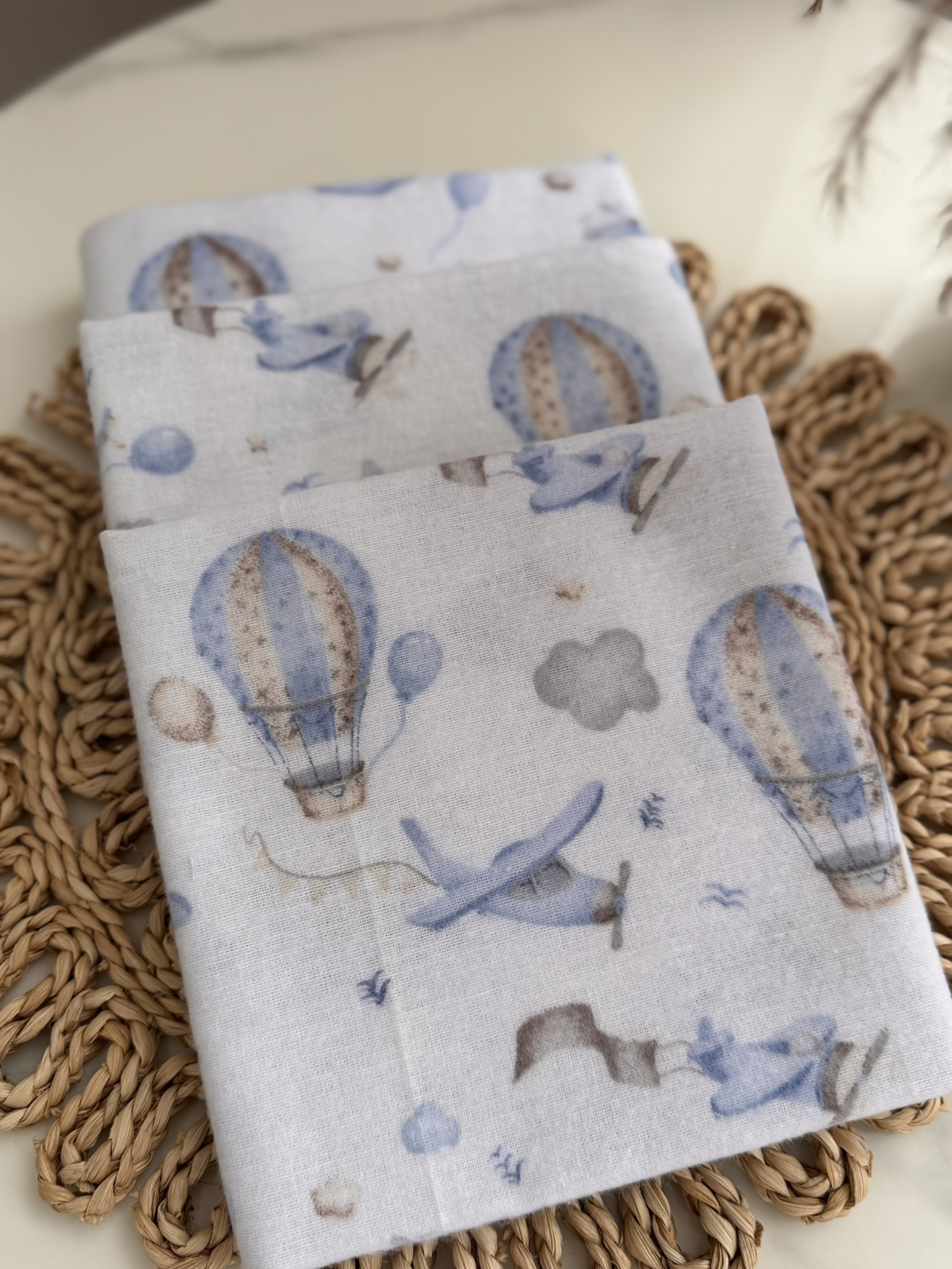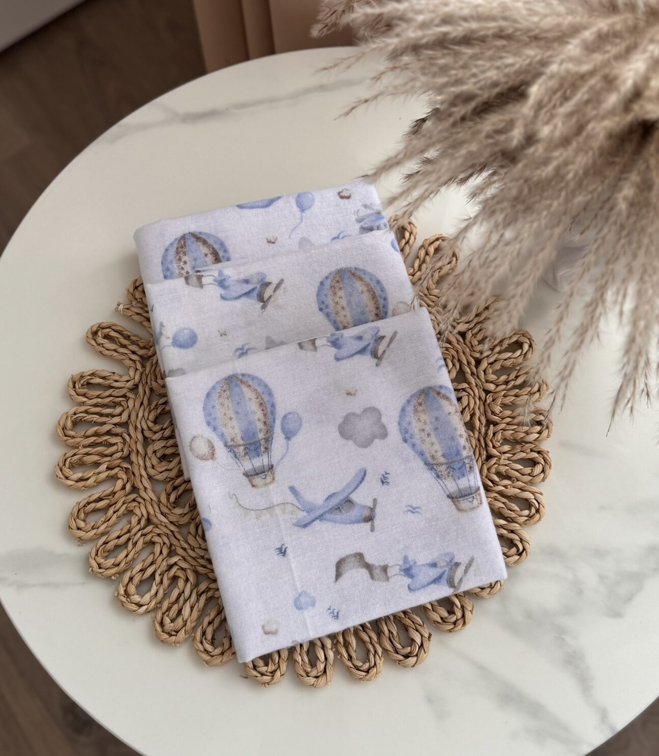 Flaneliniai vystyklai kūdikiams – 2 vnt. rinkinys su oro balionų bei lėktuvėlių raštais.