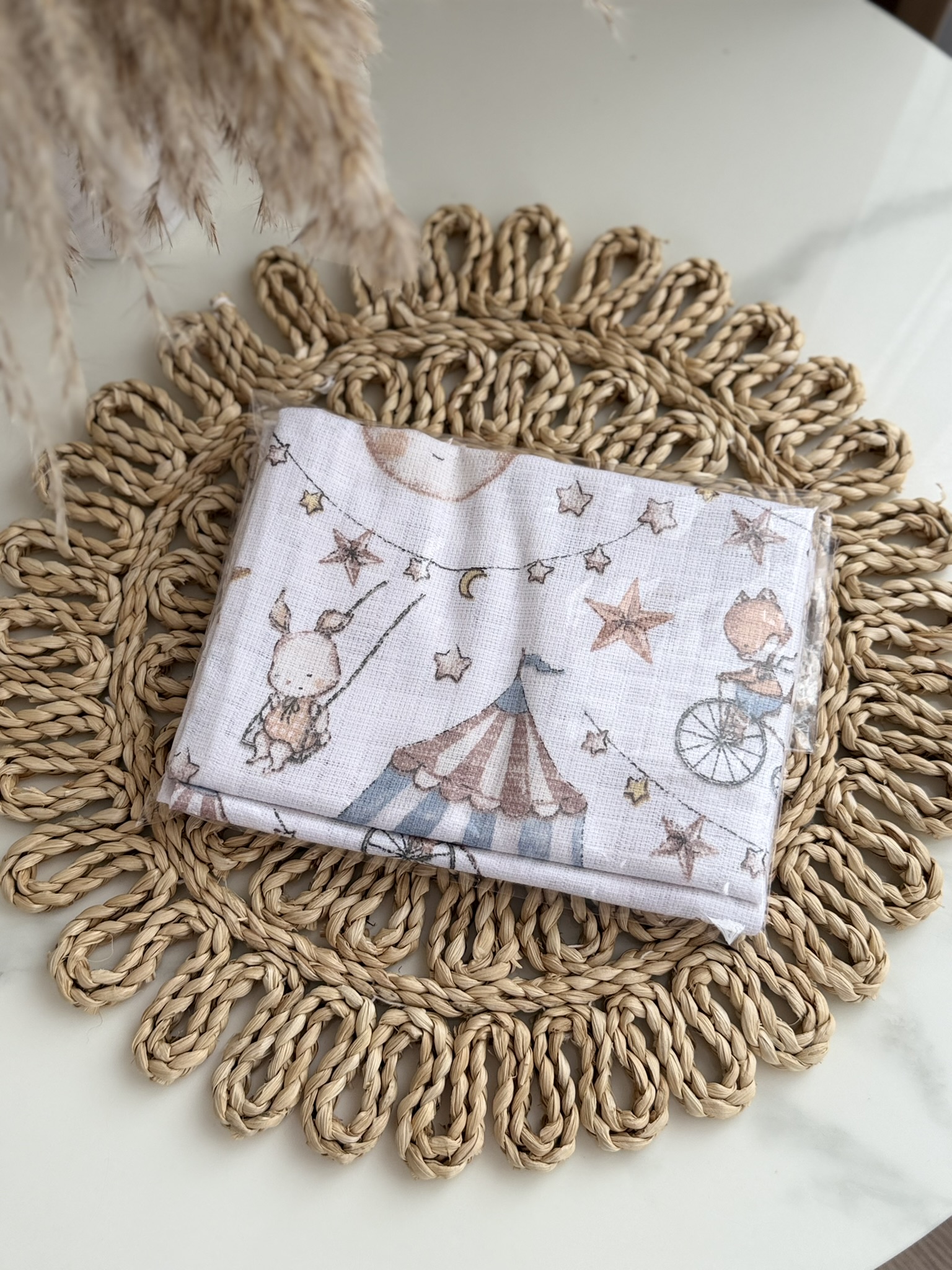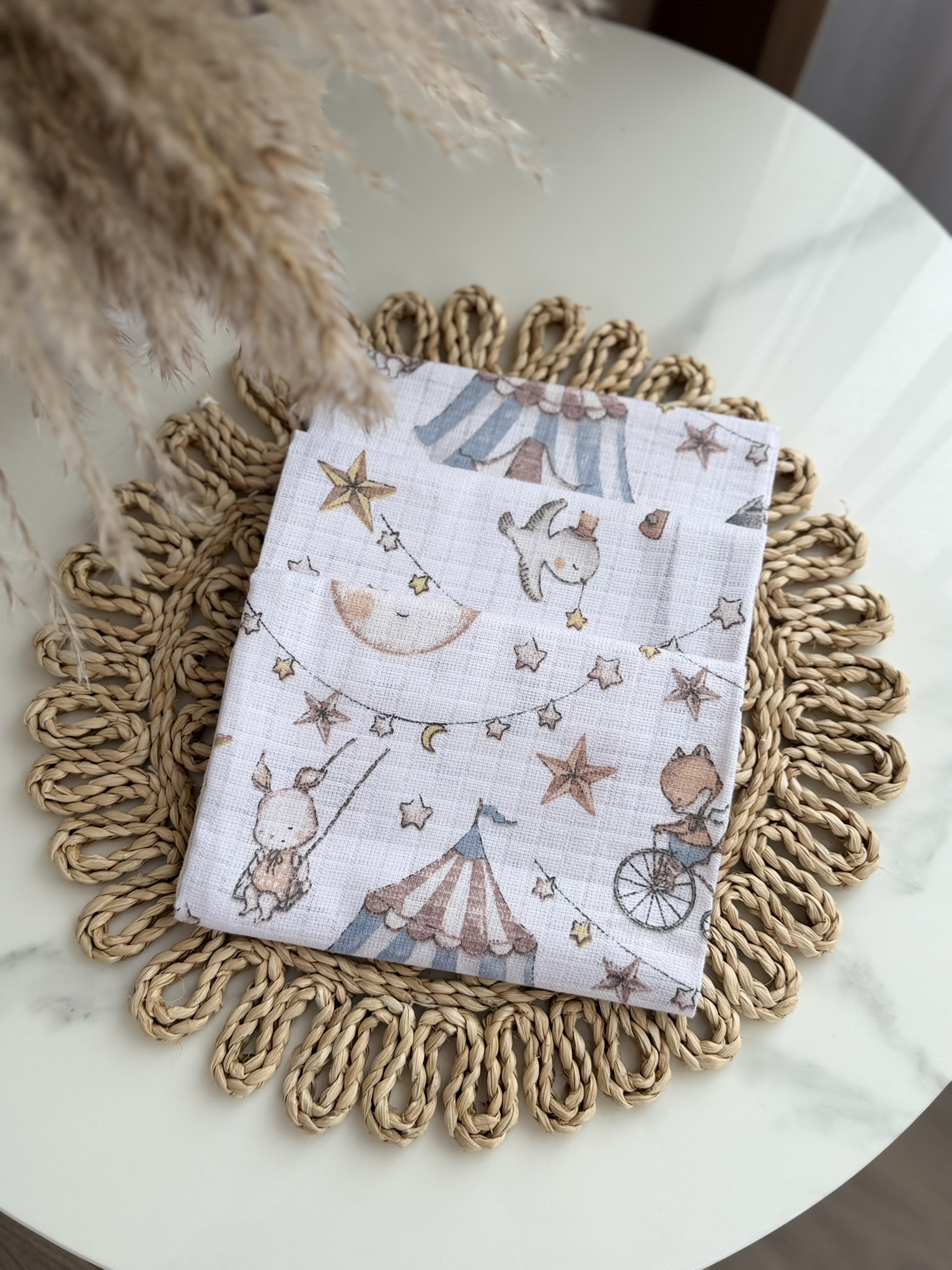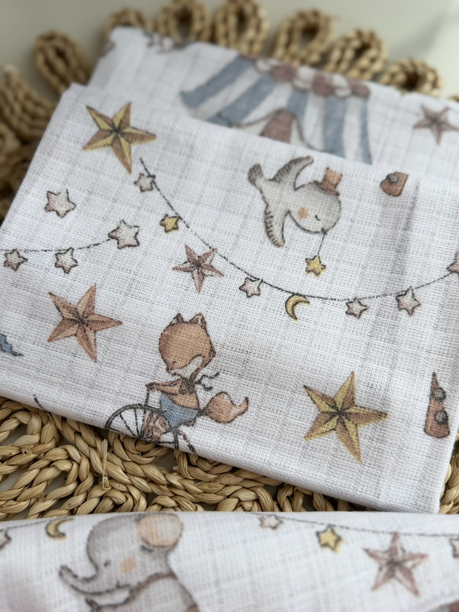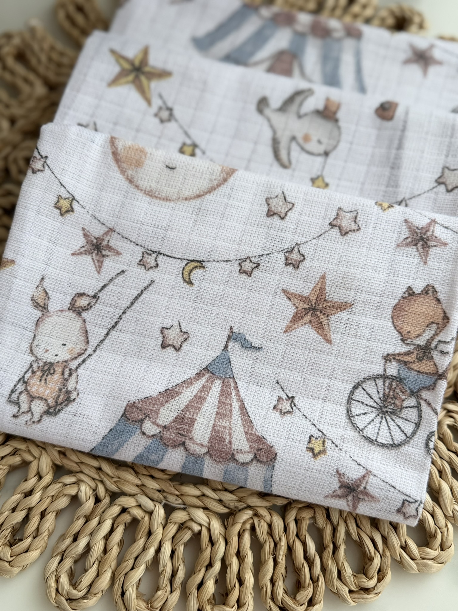 Dvigubi merliukai kūdikiams – 3 vnt. rinkinys su skirtingais cirko raštais.