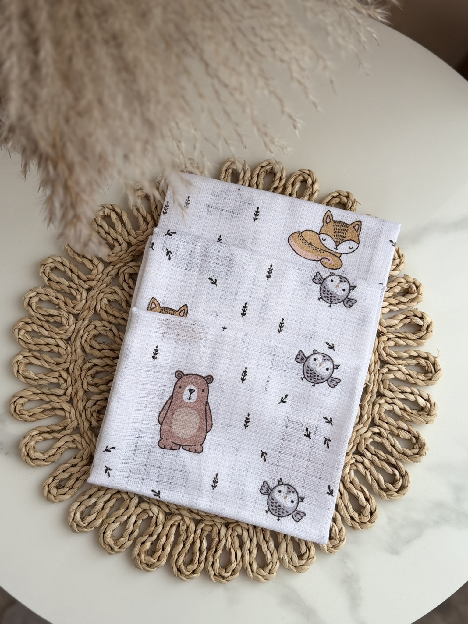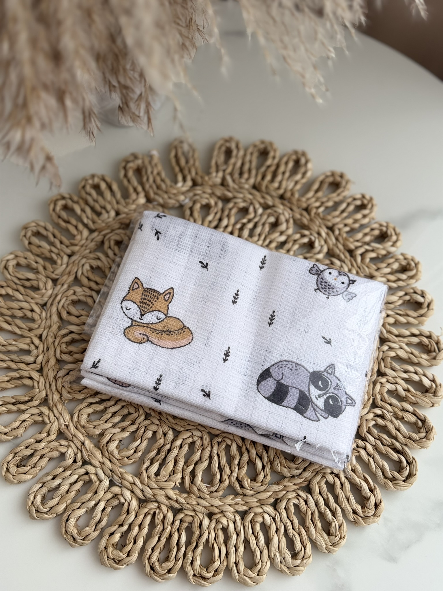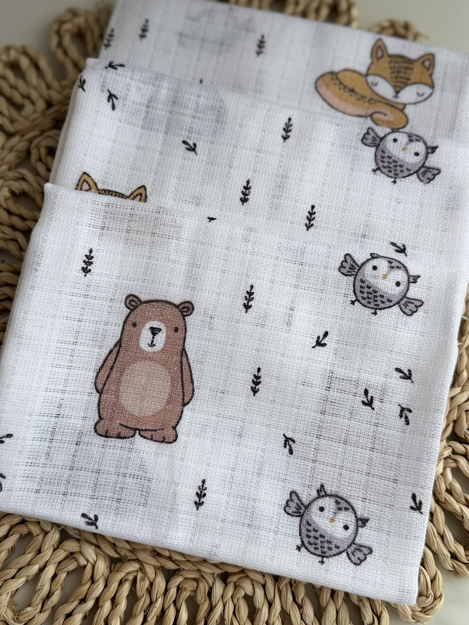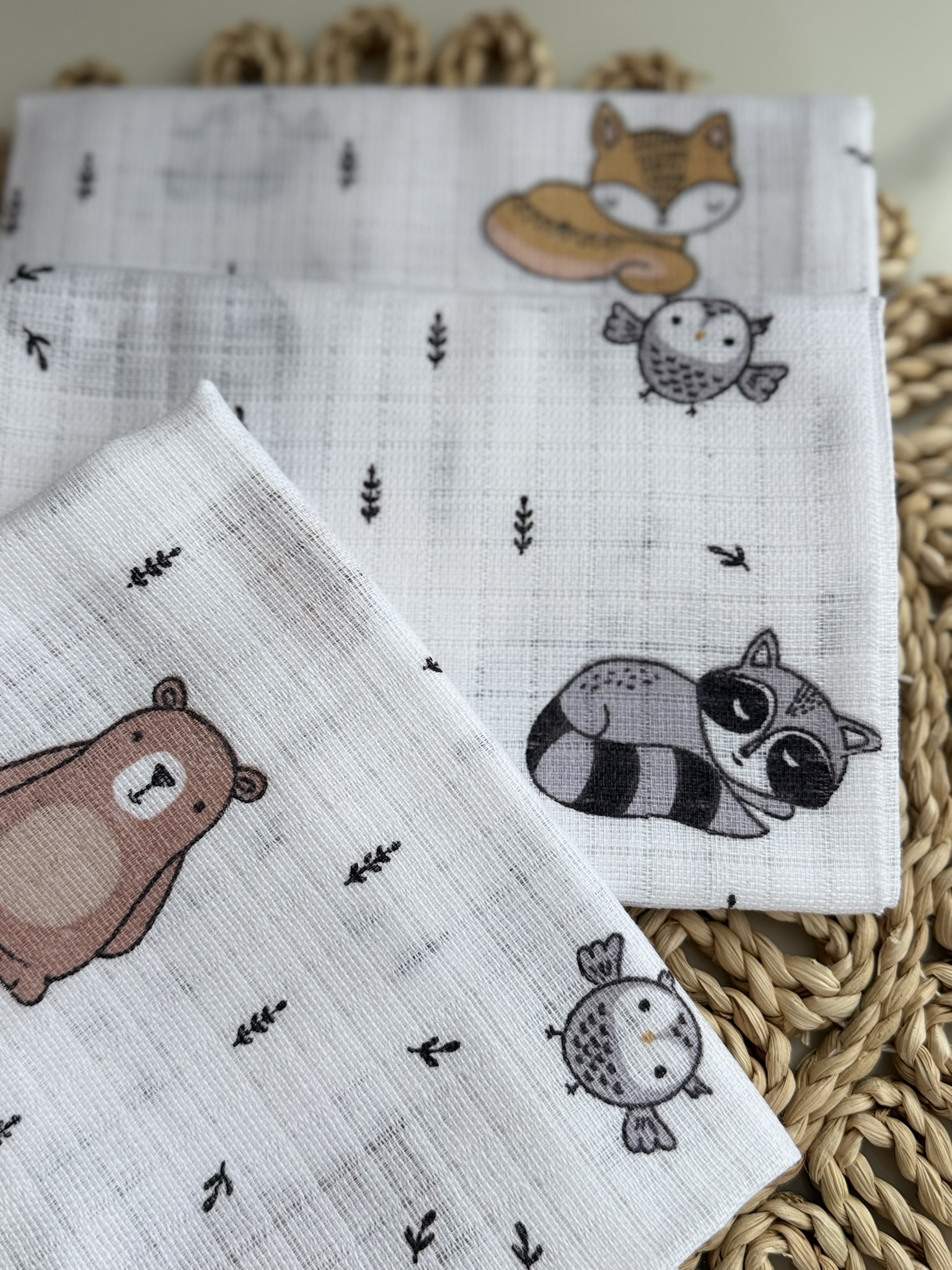Dvigubi merliukai kūdikiams – 3 vnt. rinkinys su miško gyvūnų raštais.