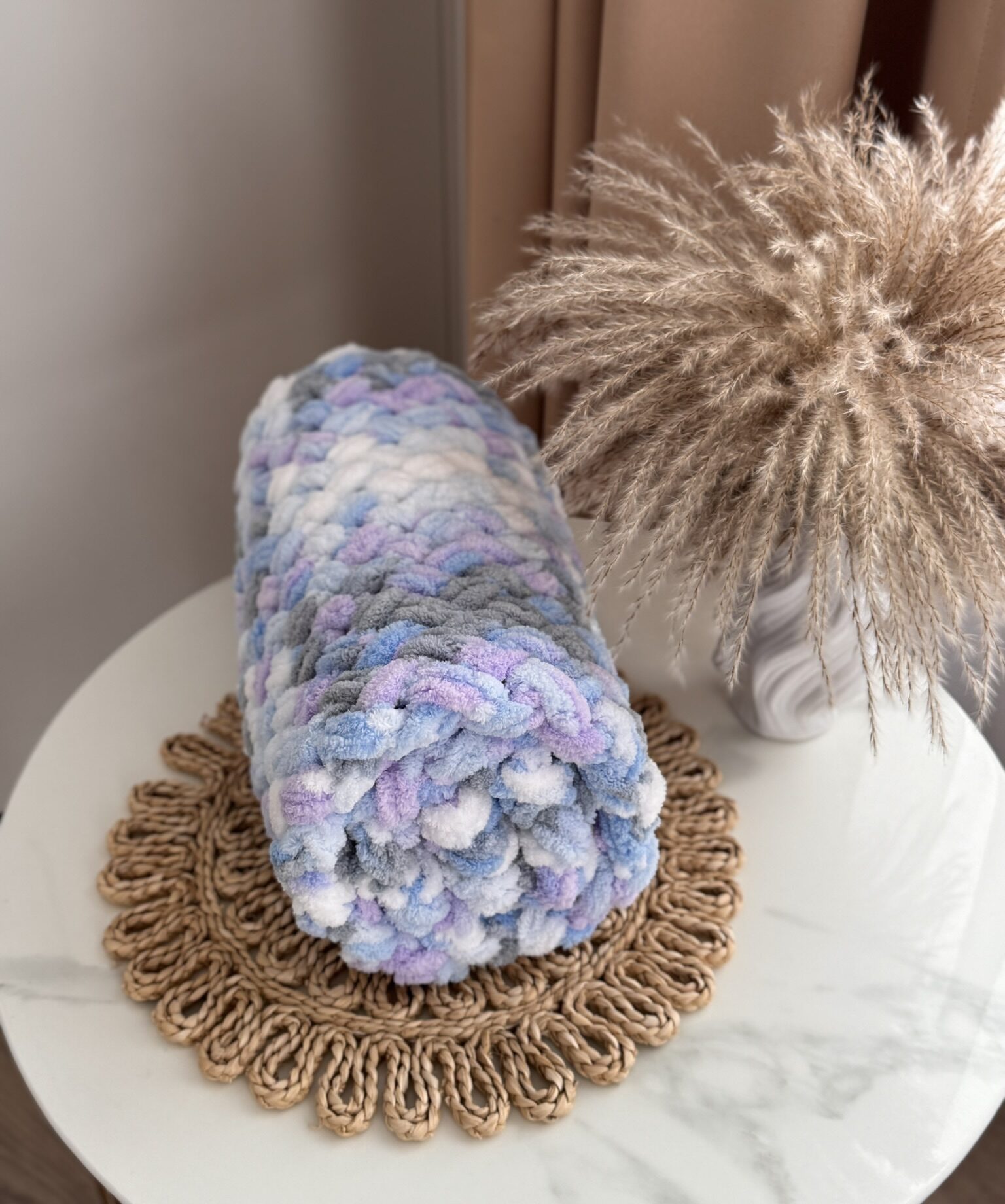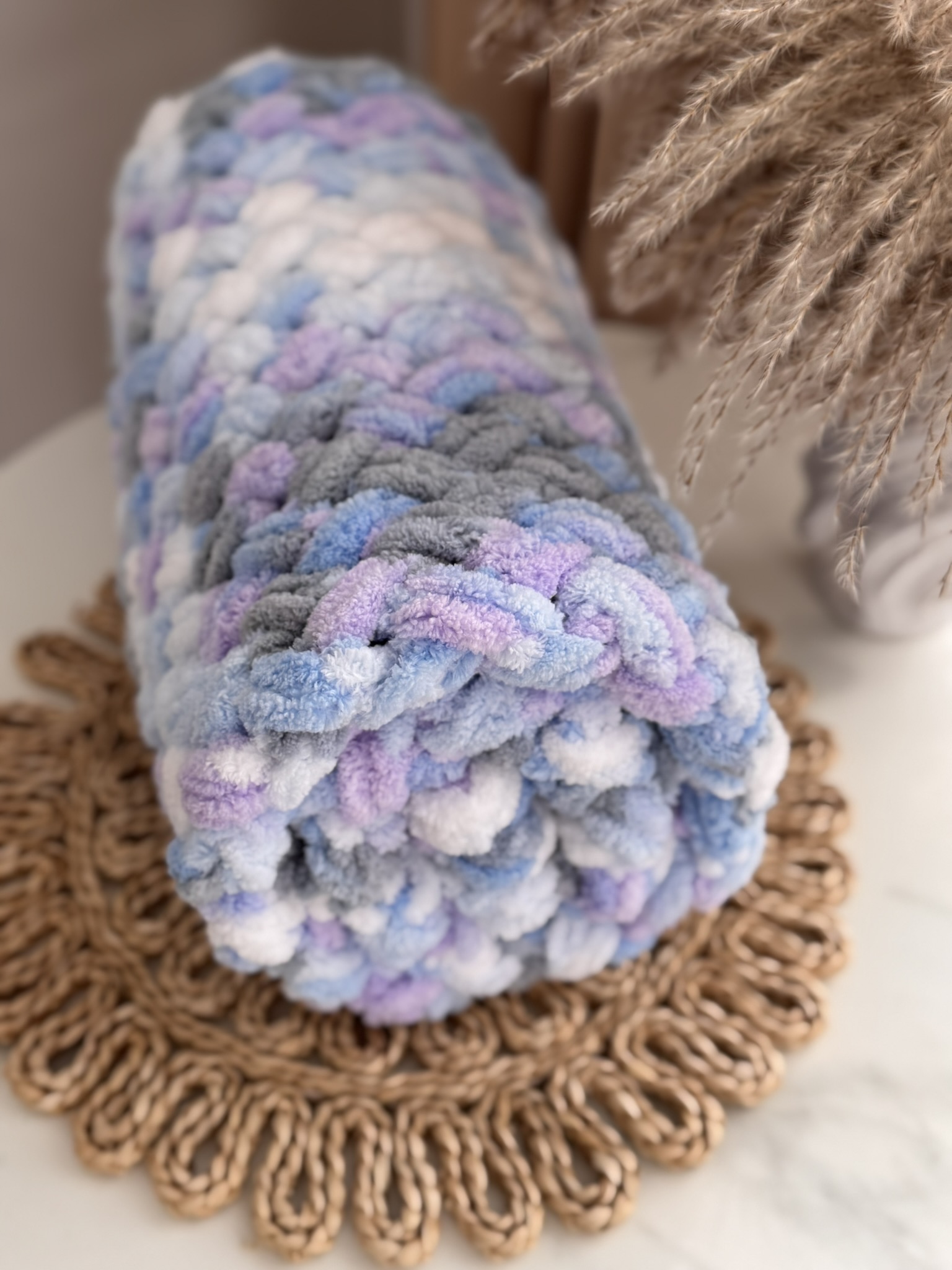 Rankų darbo nertas pledas iš purių ir minkštų Puffy siūlų.